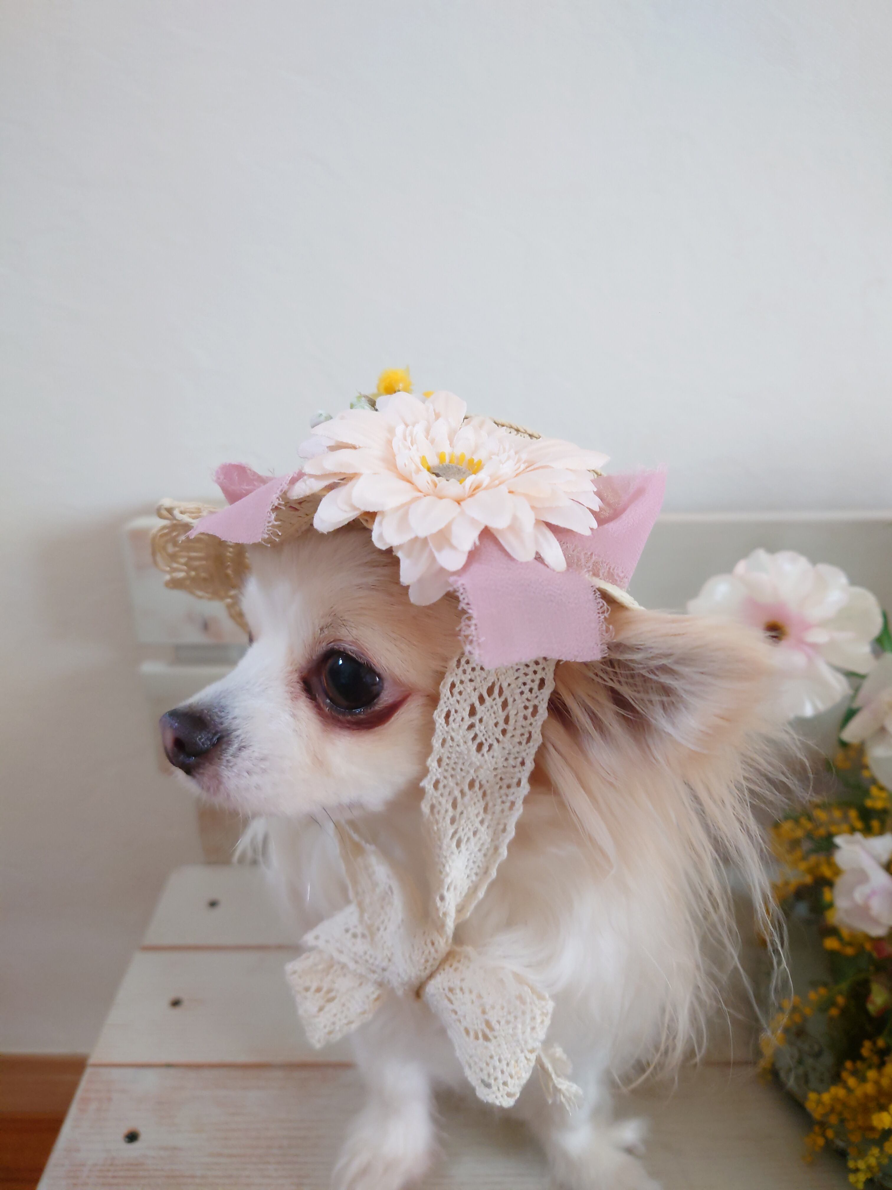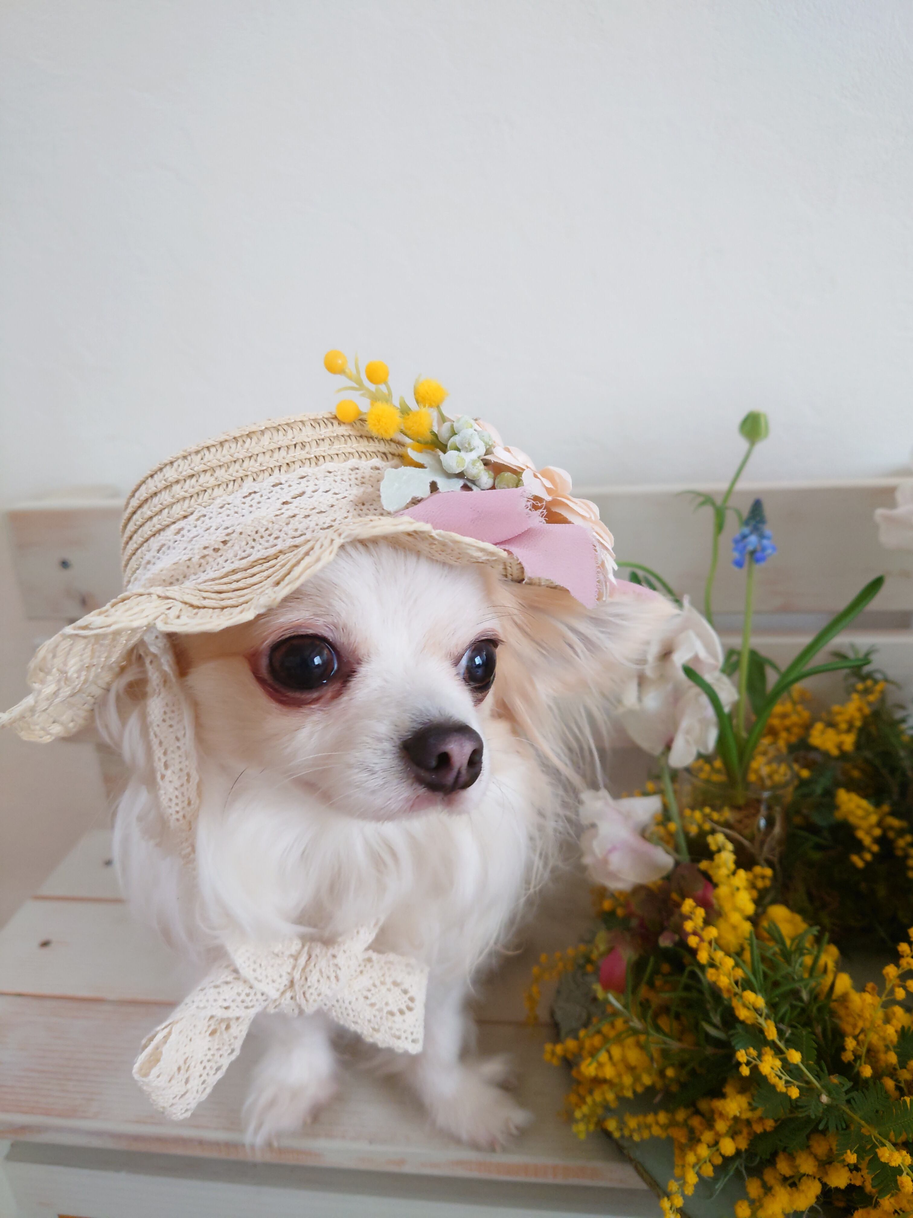 フローリストがデザインしたハンドメイドの花飾り付き麦わら帽子です。華やかな花飾りがワンちゃんの可愛さを引き立てます。