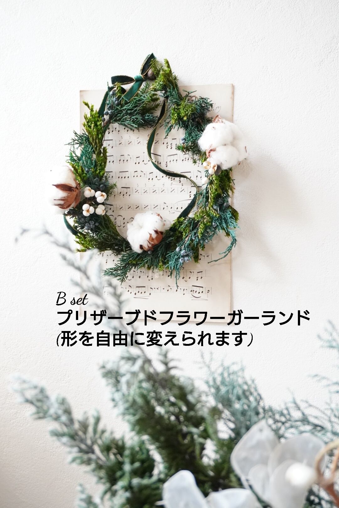 Asetは生木の針葉樹で森の香りを楽しんでいただけるアレンジメント、Bsetは半永久的に飾っていただけるプリザーブドフラワーのクリスマスガーランドです。