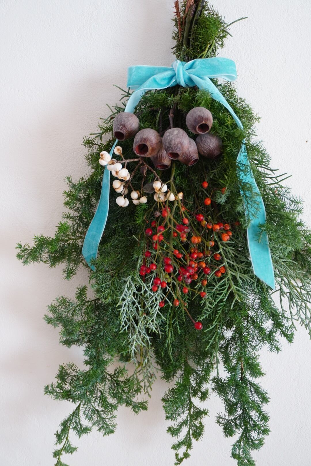 生木のサツマ杉、ブルーアイスにノイバラの実とナンキンハゼ、ユーカリトランペットをあしらっています。